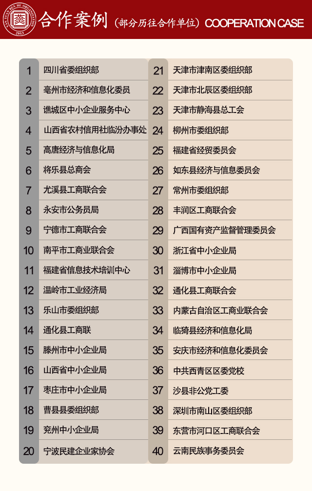 與山東淄博市中小企業(yè)局、各區(qū)縣組織部及婦聯(lián),先后舉辦了六期“山東企業(yè)總裁工商管理(淄博)研修班”、“山東高級(jí)管理人員工商管理(張店區(qū))研修班”、“山東高級(jí)管理人員工商管理(博山區(qū))研修班”、“山東高級(jí)管理人員工商管理(臨淄區(qū))研修班”、“山東高級(jí)管理人員工商管理(淄川區(qū))研修班”、“山東淄博印刷行業(yè)高層工商管理研修班”及“山東淄博魅力女性高級(jí)研修班”。